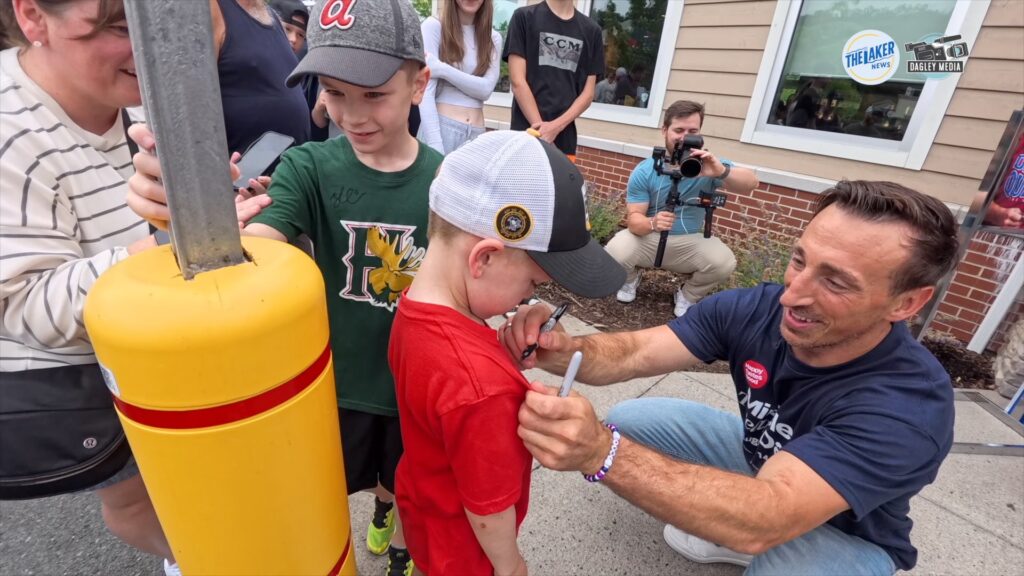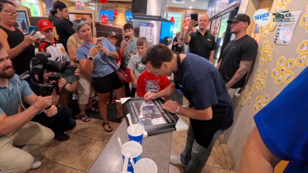 NHL Florida Panthers star Brad Marchand signs a framed photo of himself for a young boy at the Dairy Queen in Fall River. Marchand was there as the spokesperson for Miracle Treat Day. (Healey photo)